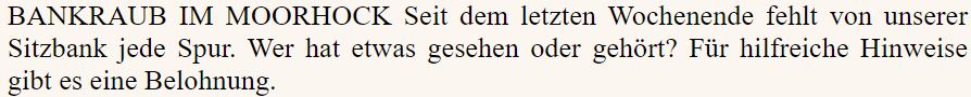 „Ok, zuerst müssen wir wissen, seit wann die Bank genau verschwunden ist, wie sie aussah und wo sie stand, bevor sie plötzlich nicht mehr da war.“ „Mmmh, also die Bank stand am Freitag hier auf der Einfahrt. Wir hatten sie am selben Morgen frisch gestrichen. Sie ist jetzt rot mit weißen Punkten. Da sie nach ein paar Stunden immer noch nicht ganz trocken war, ließen wir sie dort auch am Nachmittag noch stehen. Als wir am Abend aus dem Freibad wiederkamen, war sie verschwunden“, erklärt die Frau der Schlossplatzbande.